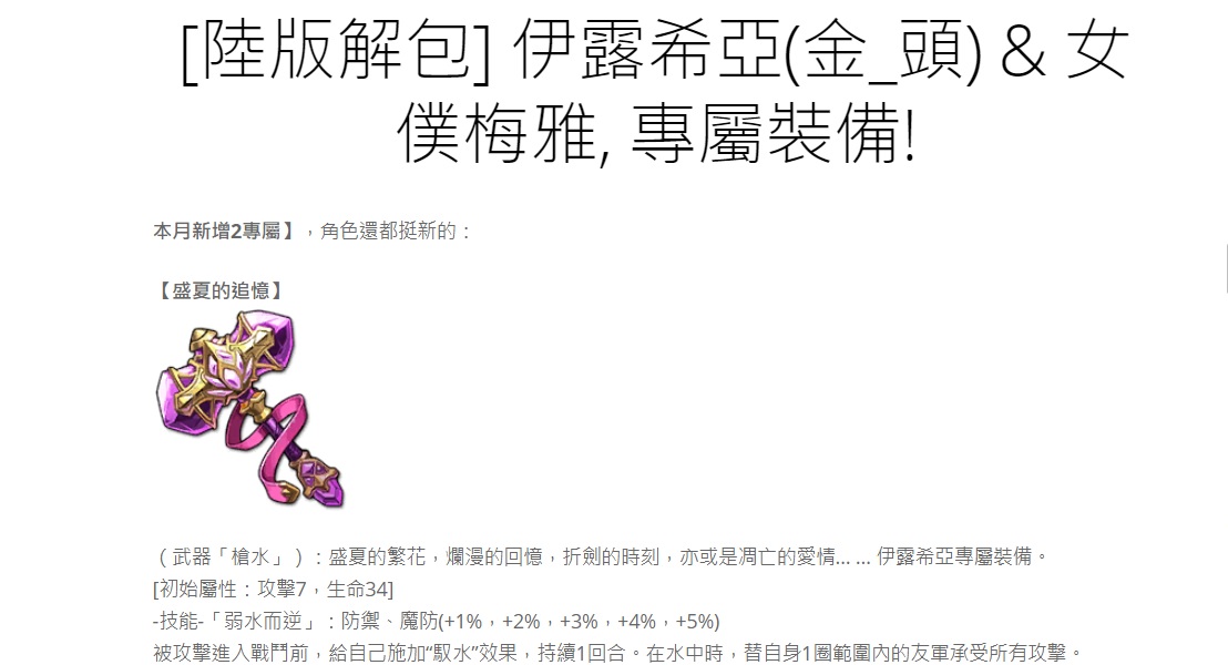 [陸版解包] 伊露希亞(金_頭) & 女僕梅雅, 專屬裝備! 夢幻模擬戰, 雜物所 本月新增2專屬】,角色還都挺新的: 【盛夏的追憶】 (武器「槍水」):盛夏的繁花,爛漫的回憶,折劍的時刻,亦或 […] More