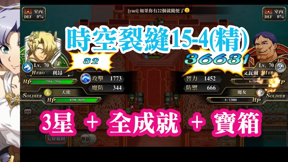 (全成就 + 寶箱) 夢幻模擬戰 時空裂縫15-4 (精英) 夢幻模擬戰, 影片攻略, 時空裂縫, 精英 要點: 1. 左上方寶箱, 100聖魔晶, 記得去拿一下 2. 左右兩邊法師射程較遠 難易度偏低的一關, 祝大 […] More