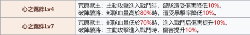 – 心之羈絆以騎兵線較為實用, 主攻就有10%增傷, 適合輸出手定位
