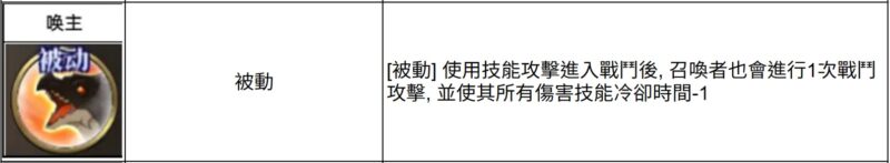 – 被動, 使用技能攻擊進戰後, 召喚者也會進行1次攻擊(無視距離, 即使4格外也會跳過來出手)