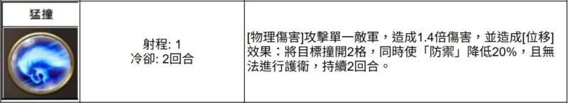 – 戰後[位移]擊退3格, 路徑上如有其他部隊或無法進入的地形時