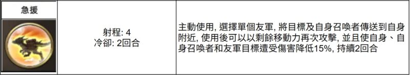 – 之後可以用剩餘移動力再次攻擊, 並使目標友軍/自身/召喚者遭受傷害-15%