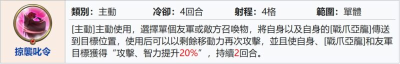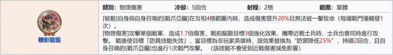 – 被動, 戰爪亞龍在4格內時, 自身和戰爪亞龍, 造成傷害+20%, 且不屈一次