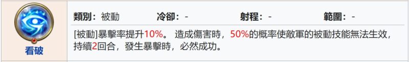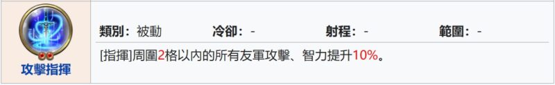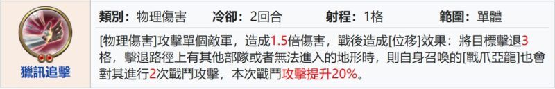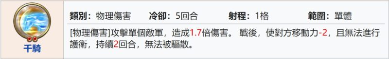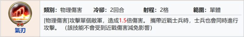 – 1.7倍傷害, 射程2格, 冷卻5回合, 戰前3驅, 近戰士兵也會一起以2格出手