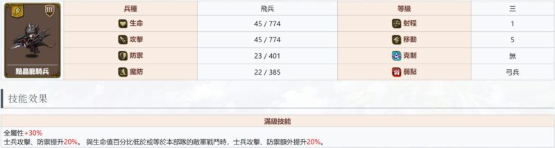 驍將(騎) – 部隊血量高於80%時, 遭受暴擊率-10%