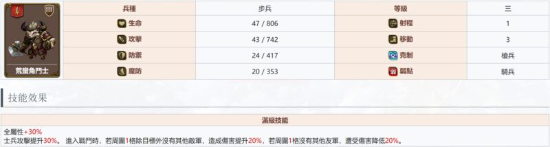 獸主(步) – 部隊血量低於70%時, 進戰傷害+10%