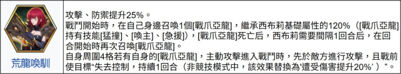 – 西布莉4格內有[戰爪亞龍], 主攻進戰時, 先制攻擊, 戰前使目標失去控制(PVP)或遭受傷害+20%(PVE)