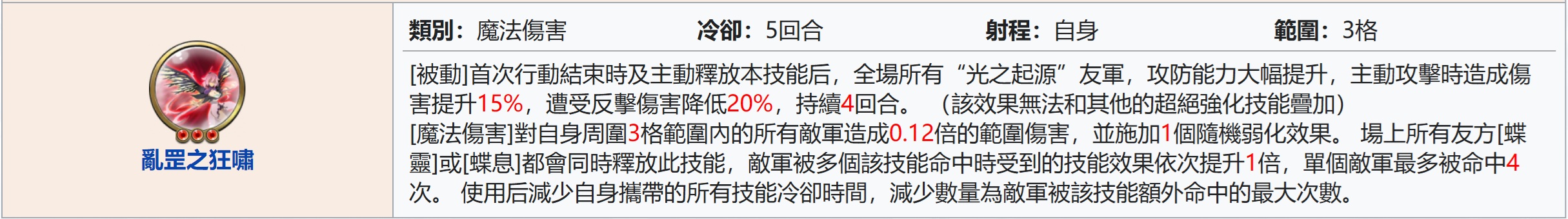 – 自身3格範圍 x 0.12倍的範圍傷害, 1個隨機弱化