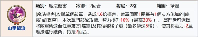 – 戰後, 可傳送該敵軍至任意[蝶靈]及其相鄰格子旁 (最多傳送5格), 並使其-2移動力, 不能護衛