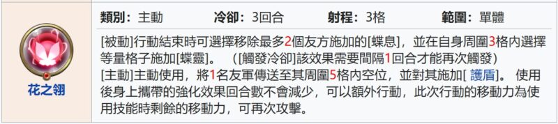 – 首個友軍通過[蝶靈]1圈範圍後, 行動結束時獲得持續3回合的[蝶息]