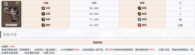 – 戰前令敵方遭受傷害+10%, 從而觸發法師營的[法力虛空] = 攻防提升20%