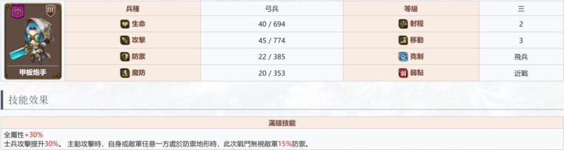 – 45攻擊 + 30%攻擊提升, 敵我雙方任一在防禦地形時, 無視15%防禦, 火力滿滿