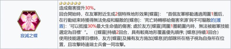 – [蝶息]: 抵擋最大生命30%的護盾, 以及在「友方」[蝶靈]1圈時, 無法被敵軍技能選為目標