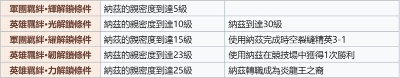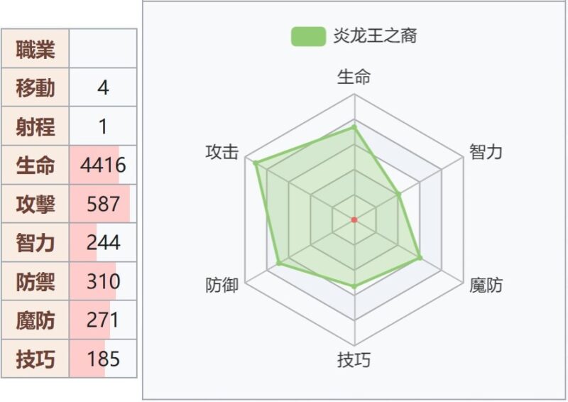 – [炎龍王的領域]: 敵軍於其上行動結束時, 受到1倍的固傷, 並遭受來自納茲的傷害+15%