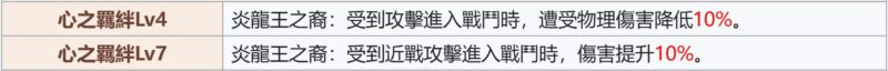 心之羈絆LV4 – 受到攻擊進戰時, 遭受物理傷害 -10%