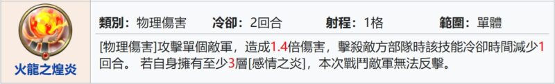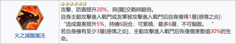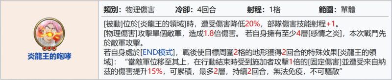– 被動, 處於[炎龍王的領域]時, 遭受傷害-20%, 部隊傷害技能射程+1