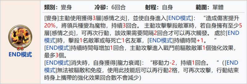 – [END模式]: 增傷20%, 並自身兵種變為魔物, 持續3回合