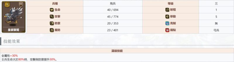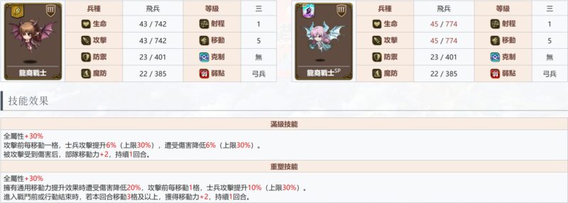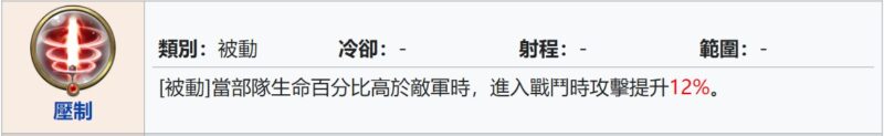 – 無條件攻防+20%, 與[龍]交戰時翻倍, 以上對應單點/範圍攻擊/小兵