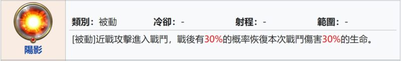 – 持有3層或以上[感情之炎]時, 主攻進戰後, 恢復造成傷害30%的血量