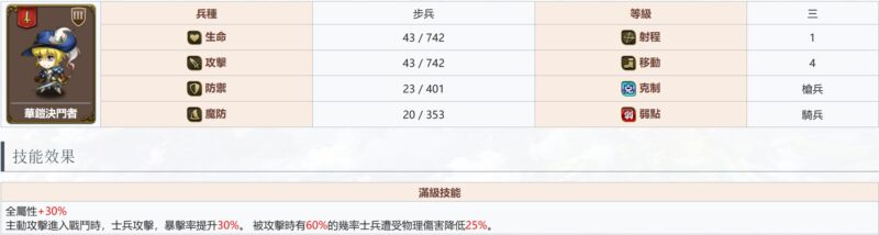 – 戰前每移動1格, 攻擊+10% (最多30%)