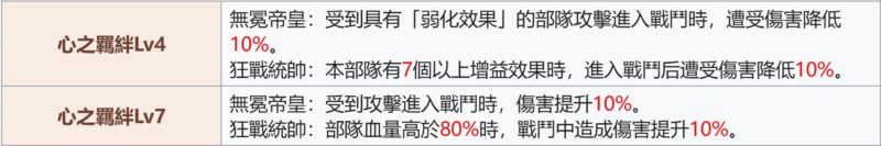 統帥(騎) – 持有7個或以上強化時, 進入戰鬥的遭受傷害-10%