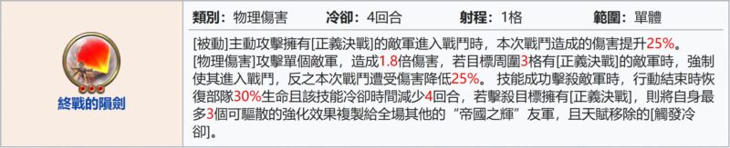 – 被動, 主動攻擊持有[正義決戰]的敵軍進入戰鬥時, 造成傷害+25%