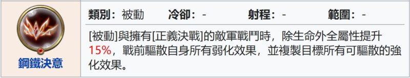 – 被動, 與持有[正義決戰]的敵軍戰鬥時, 除生命外全屬性+15%