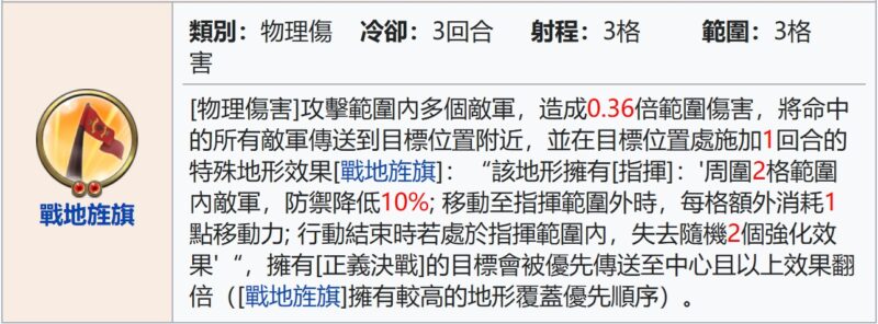 – 並在目標位置施加1回合的地形效果[戰地旌旗]