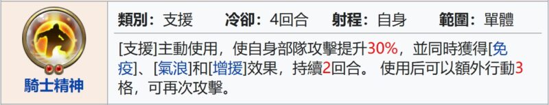 – [戰地旌旗], 指揮: 2格內敵軍防禦-10%, 移動至指揮範圍外時, 每格額外消耗1移動力