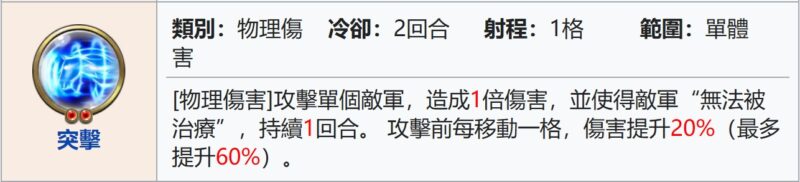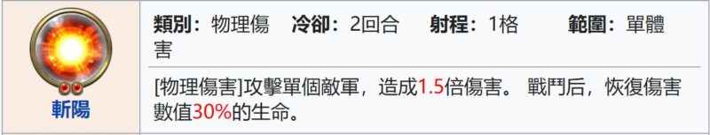 怒濤 – 主攻時額外+10%攻, 同時減低戰損, 保持健康狀態二動再出手