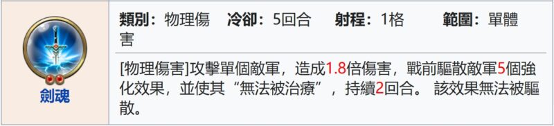 – 戰前5驅並禁療, 1.8倍高額傷害技能, 但冷卻較長