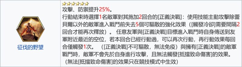 – [正義決戰]: 該敵軍使用技能攻擊蕾貝爾以外的我軍時, 進戰前被驅散5個強化